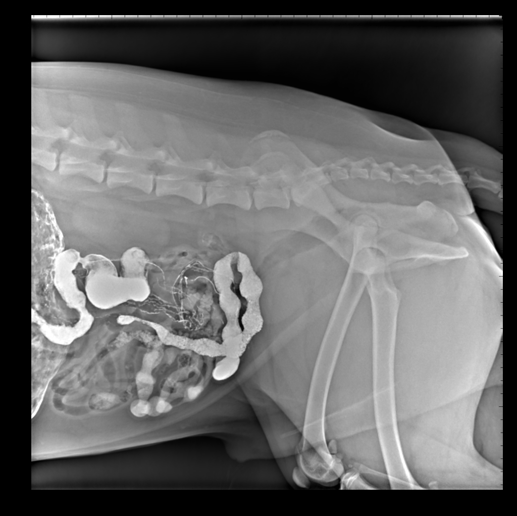 胃肠造影显示回肠盲肠升结肠横结肠侧位片